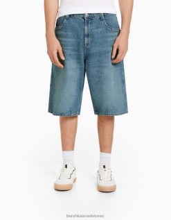גברים מכנסי ברמודה ג’ינס רחבים נשטף כחול 2L6JD3337 Bershka הַלבָּשָׁה