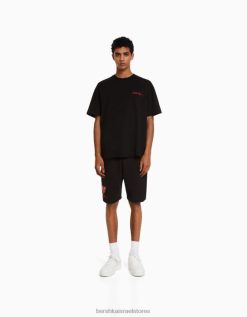 גברים מכנסי ברמודה עם הדפס סלוגן שָׁחוֹר 2L6JD3348 Bershka הַלבָּשָׁה
