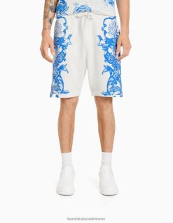 גברים מכנסי ברמודה קטיפה מודפסים בגזרה רגועה כְּחוֹל 2L6JD3350 Bershka הַלבָּשָׁה
