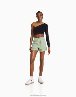 נשים מכנסי ברמודה קצרים מכותנה בשקית נייר ירוק 2L6JD1688 Bershka הַלבָּשָׁה