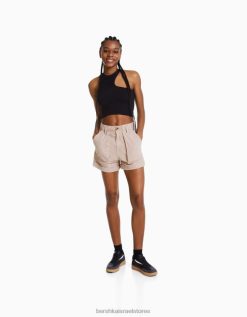 נשים מכנסי ברמודה קצרים מכותנה בשקית נייר גָמָל 2L6JD1690 Bershka הַלבָּשָׁה