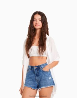 נשים מכנסי ג’ינס קצרים בגזרה גבוהה כחול בהיר 2L6JD1732 Bershka הַלבָּשָׁה