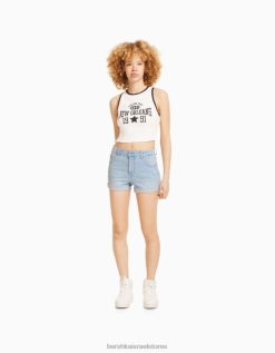 נשים מכנסי ג’ינס קצרים עם רול אפ לבן 2L6JD1727 Bershka הַלבָּשָׁה