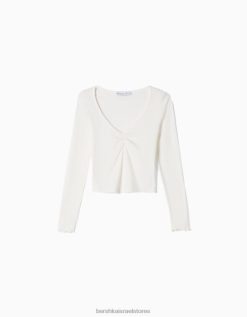 לִשְׁנֵי הַמִינִים חולצת טי עם שרוולים ארוכים עם צווארון V אסוף צבע קרם 2L6JD3837 Bershka הַלבָּשָׁה