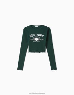 לִשְׁנֵי הַמִינִים חולצת טי קצוצה עם שרוולים ארוכים עם הדפס ירוק 2L6JD3833 Bershka הַלבָּשָׁה