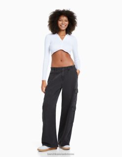 לִשְׁנֵי הַמִינִים מכנסי קרגו מכותנה בגזרה נמוכה עם חוט ניגודי אפור כהה 2L6JD3903 Bershka הַלבָּשָׁה