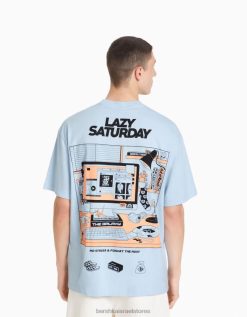 גברים חולצת טריקו בהדפס ואן גוך עם שרוולים קצרים בכושר קופסתי כחול בהיר 2L6JD2627 Bershka הַלבָּשָׁה