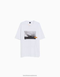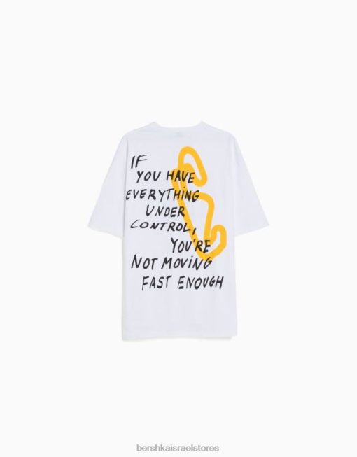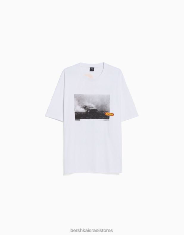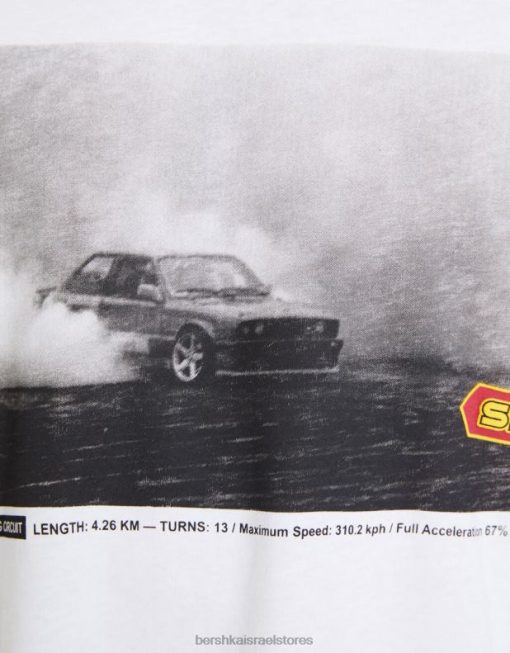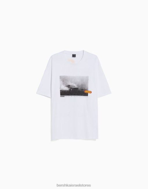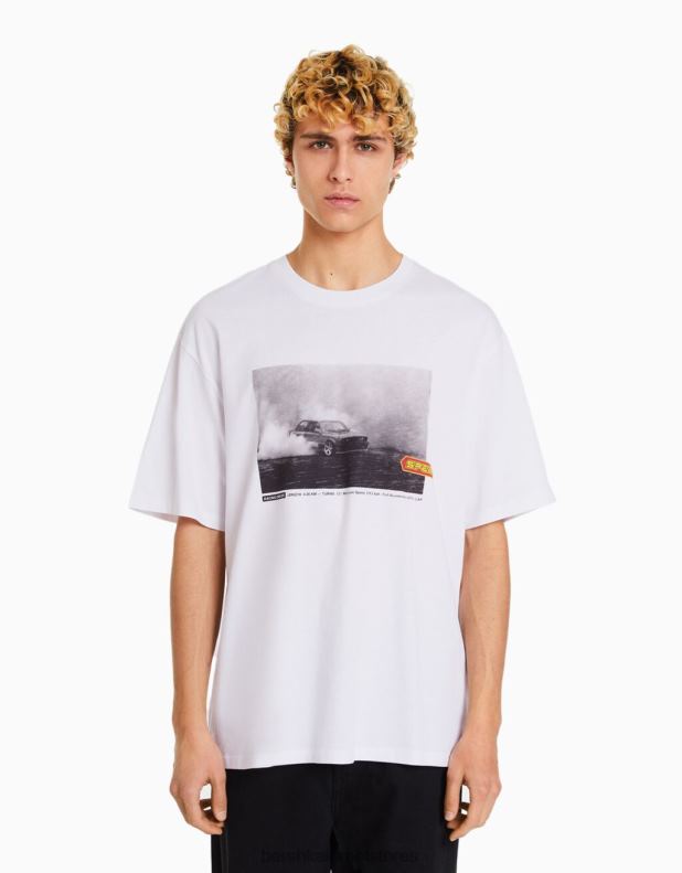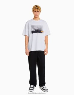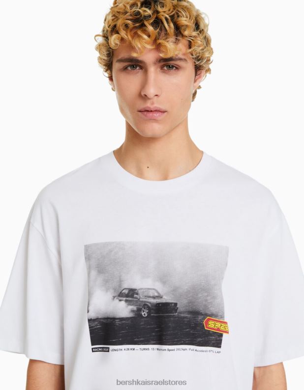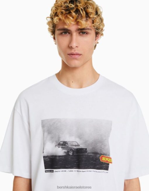 גברים חולצת טי אוברסייז עם שרוולים קצרים עם הדפס מירוצים לבן 2L6JD2621 Bershka הַלבָּשָׁה