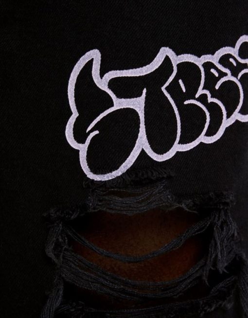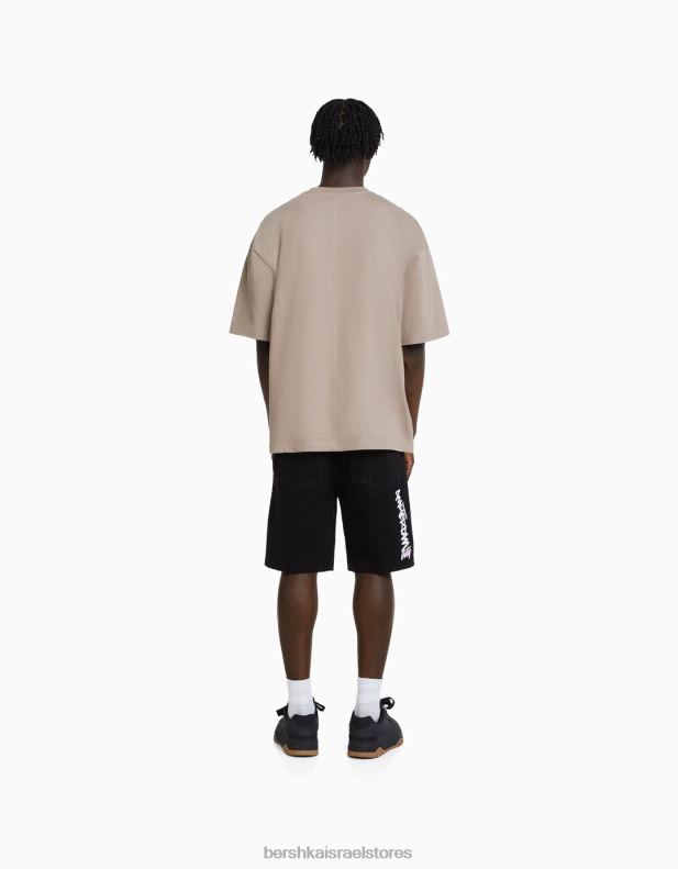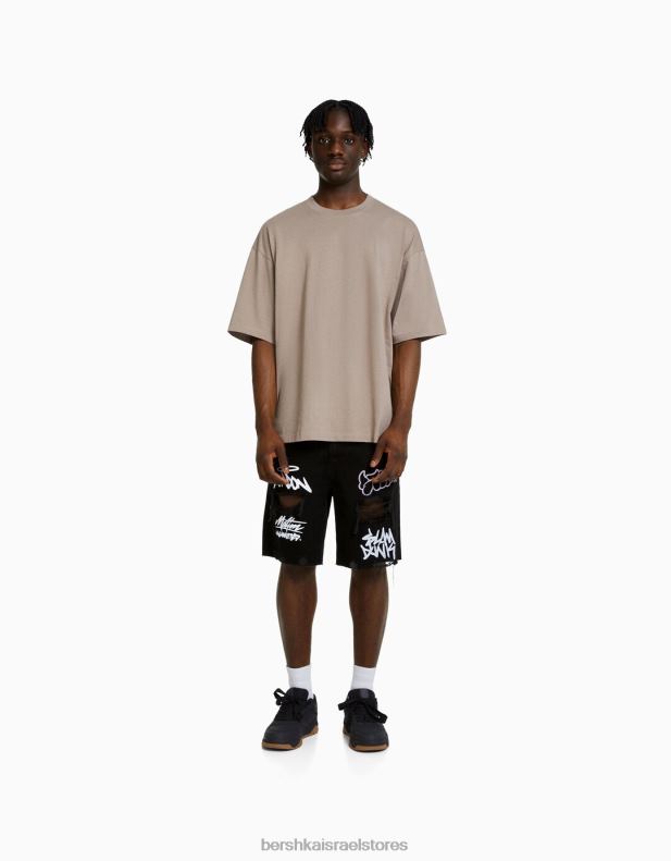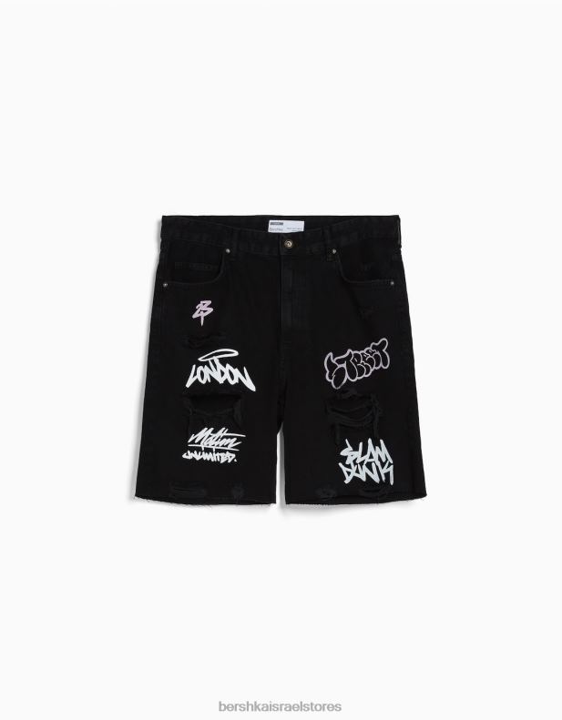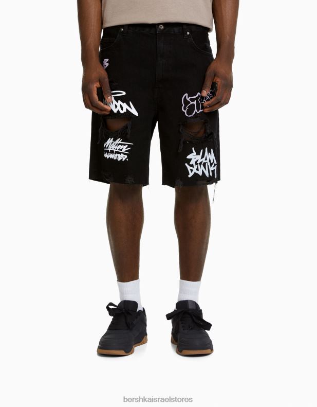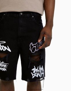 גברים מכנסי ברמודה ג’ינס קרועים מודפסים שָׁחוֹר 2L6JD3334 Bershka הַלבָּשָׁה