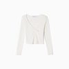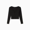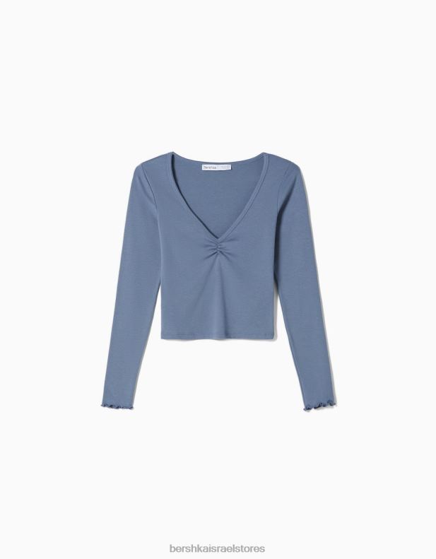 לִשְׁנֵי הַמִינִים חולצת טי עם שרוולים ארוכים עם צווארון V אסוף כְּחוֹל 2L6JD3838 Bershka הַלבָּשָׁה