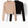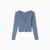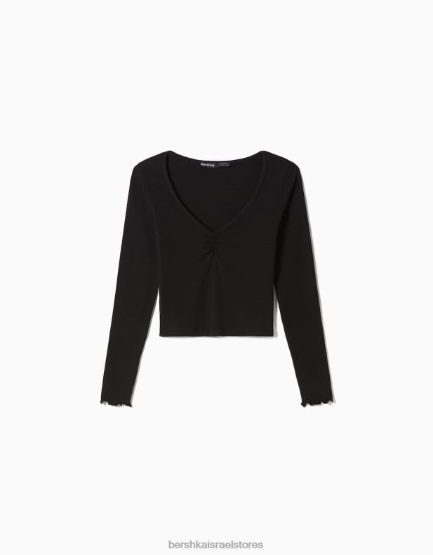 לִשְׁנֵי הַמִינִים חולצת טי עם שרוולים ארוכים עם צווארון V אסוף שָׁחוֹר 2L6JD3839 Bershka הַלבָּשָׁה