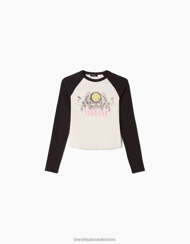 לִשְׁנֵי הַמִינִים חולצת טריקו עם שרוולים ארוכים בהדפס נירוונה צבע קרם 2L6JD3831 Bershka הַלבָּשָׁה