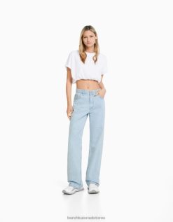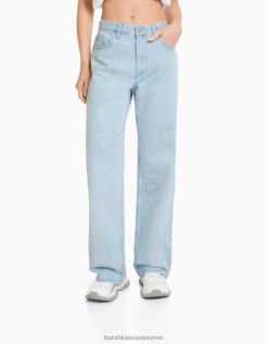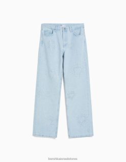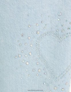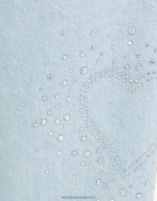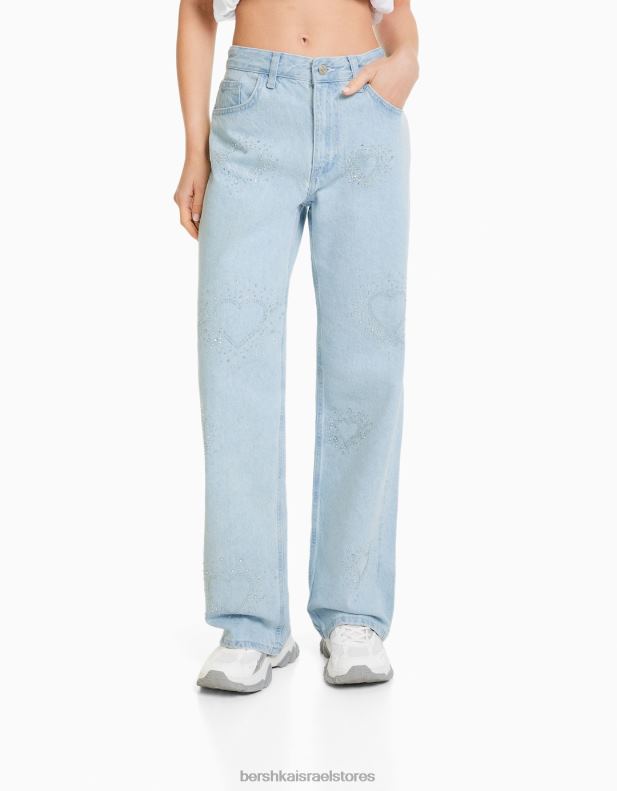 נשים ג’ינס רחב משנות ה-90 עם לבבות ריינסטון כחול בהיר 2L6JD1581 Bershka הַלבָּשָׁה