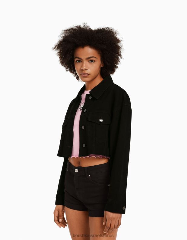 נשים ז’קט ג’ינס קצוץ שָׁחוֹר 2L6JD1104 Bershka הַלבָּשָׁה