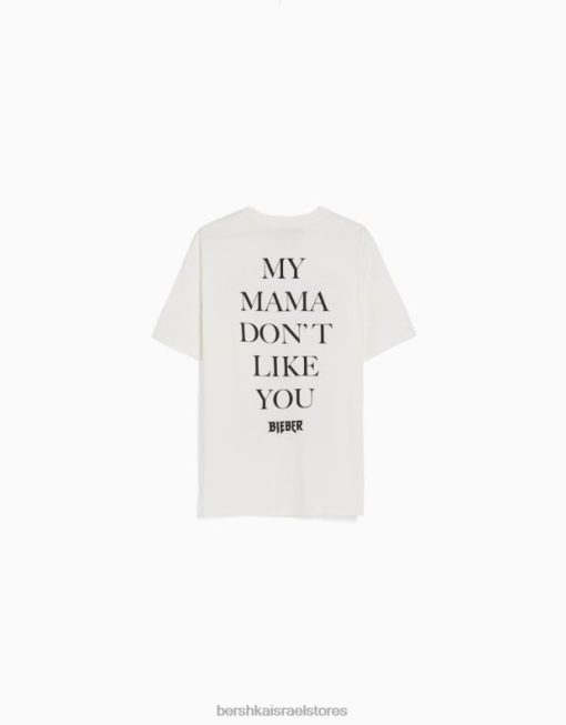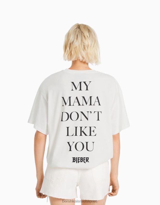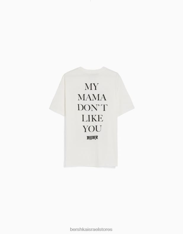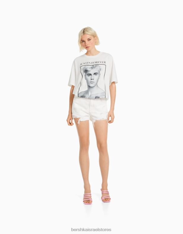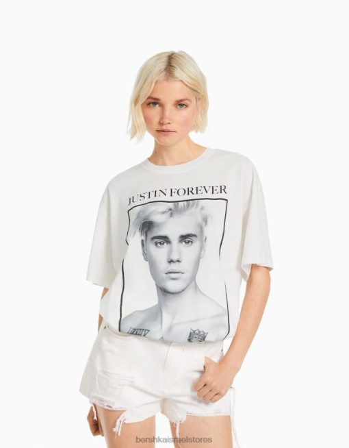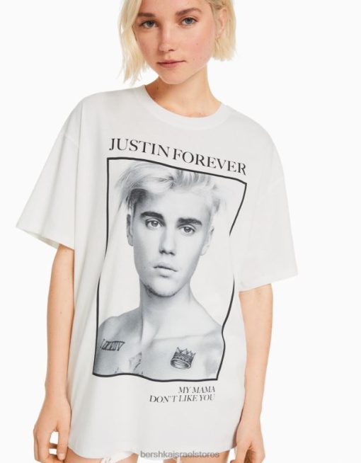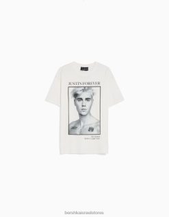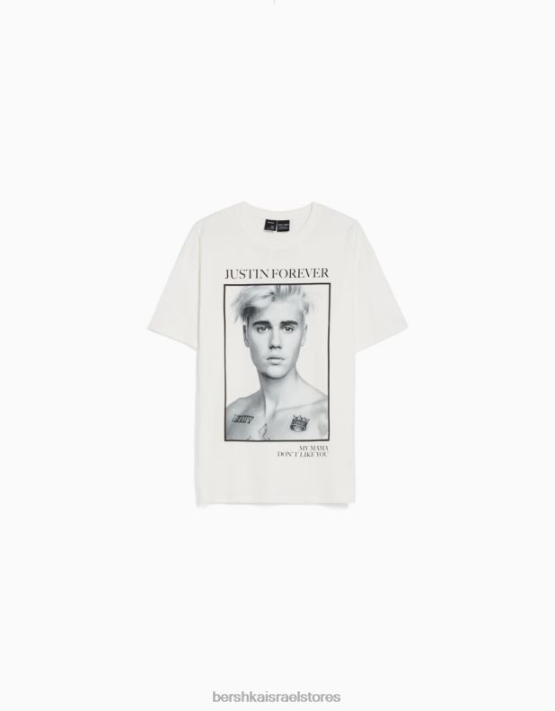 נשים חולצה בהדפס ג’סטין ביבר עם שרוולים קצרים צבע קרם 2L6JD472 Bershka הַלבָּשָׁה