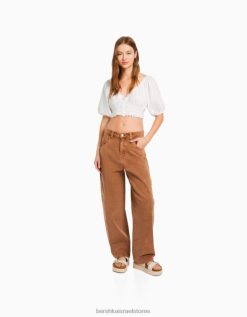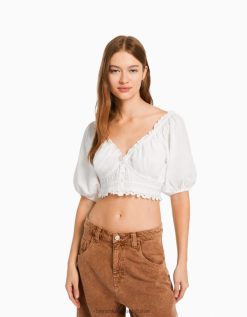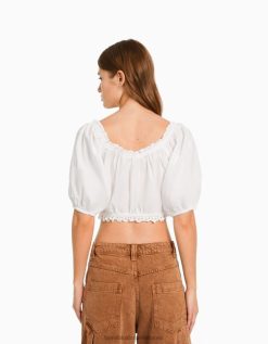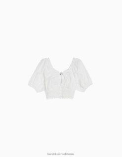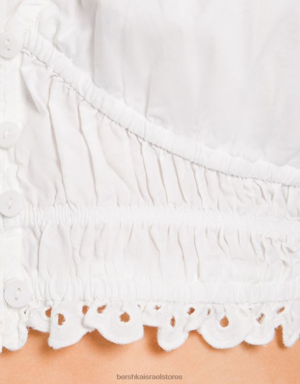 נשים חולצה עם שרוולים קצרים עם רקמה שוויצרית ופרטים משובצים לבן 2L6JD914 Bershka הַלבָּשָׁה