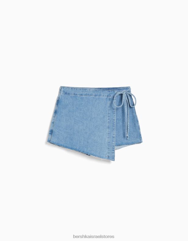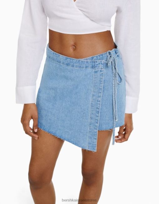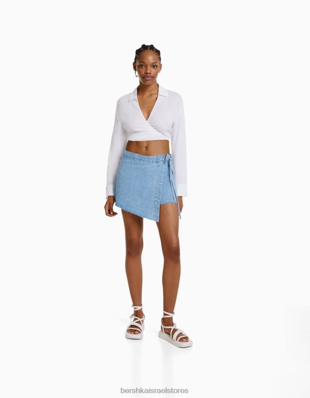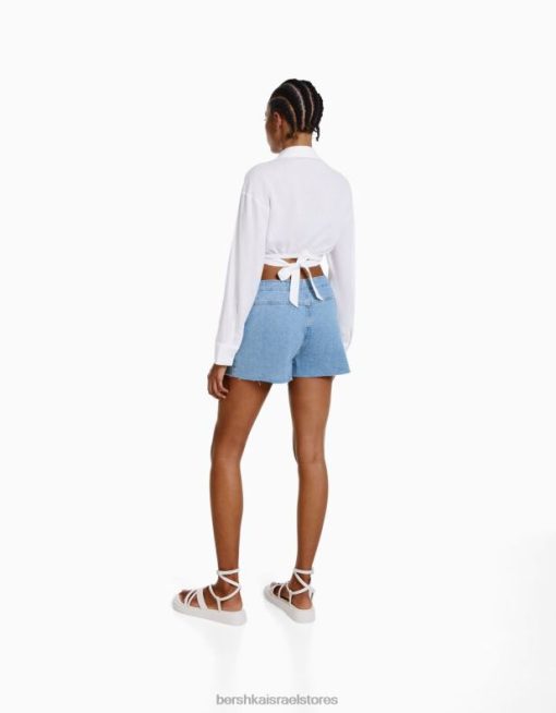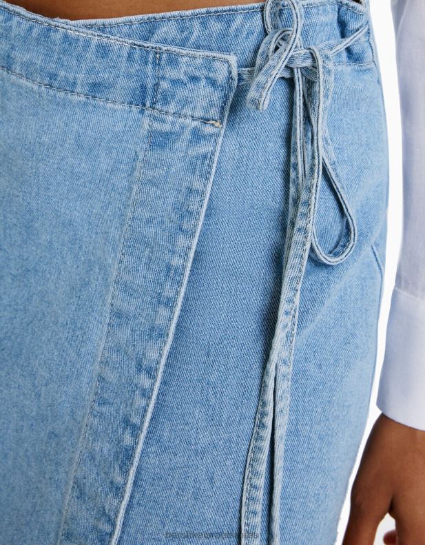 נשים חולצת ג’ינס עם קשר בצד כחול בהיר 2L6JD1664 Bershka הַלבָּשָׁה