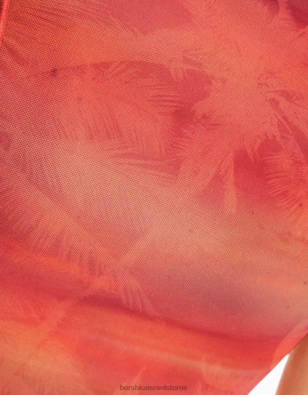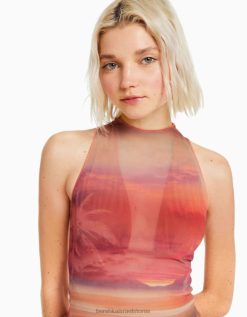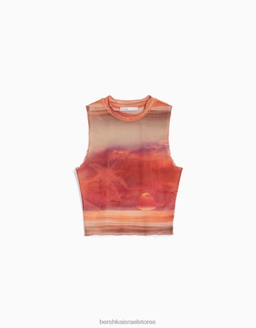 נשים חולצת טול מודפסת ללא שרוולים תפוז 2L6JD302 Bershka הַלבָּשָׁה