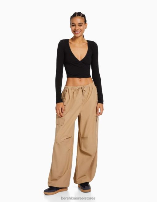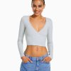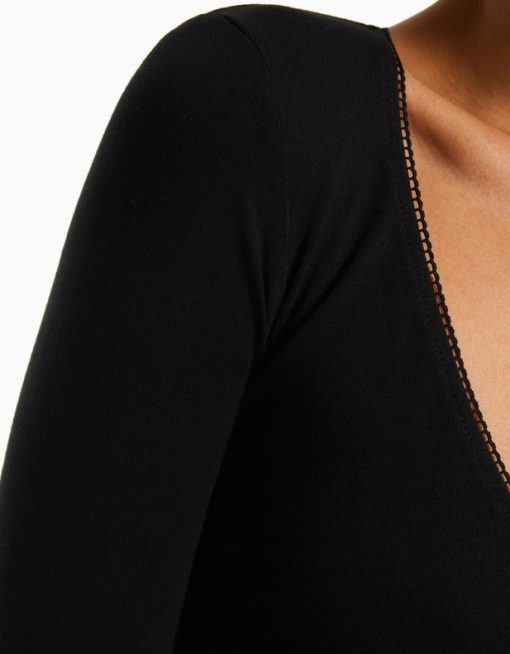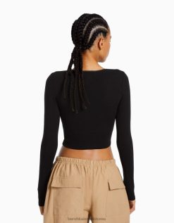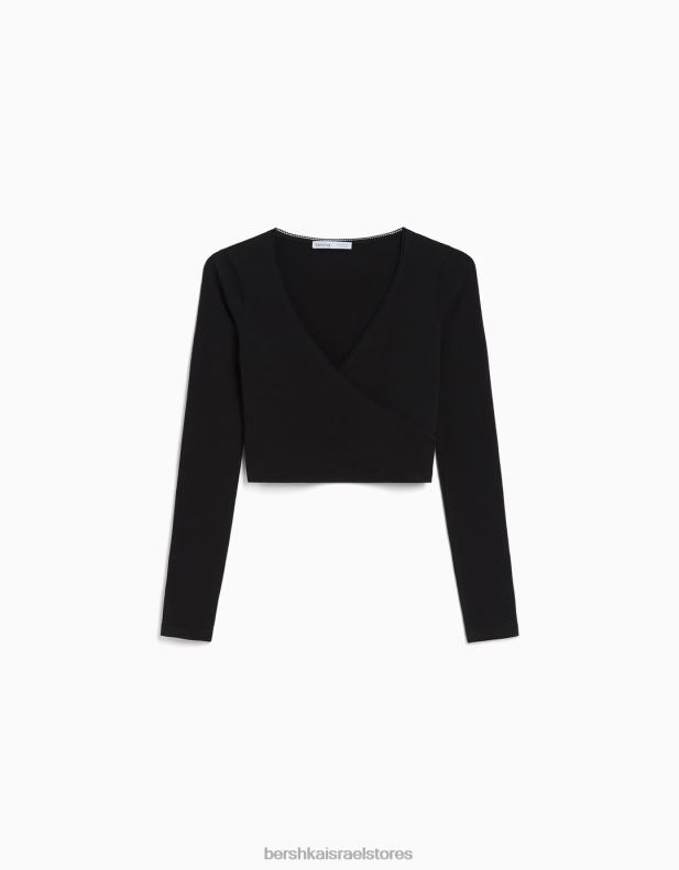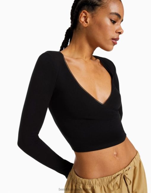 נשים חולצת טי מוצלבת עם שרוולים ארוכים שָׁחוֹר 2L6JD571 Bershka הַלבָּשָׁה