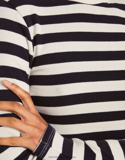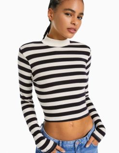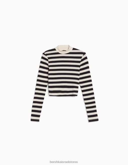 נשים חולצת טי עם צווארון גבוה לבן שחור 2L6JD409 Bershka הַלבָּשָׁה