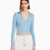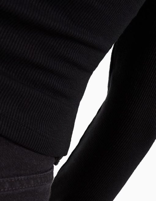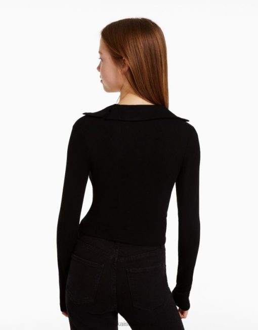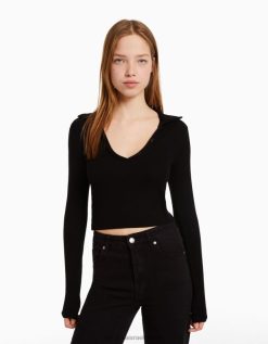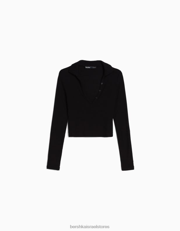 נשים חולצת טי עם שרוולים ארוכים עם צווארון פולו מכופתרת שָׁחוֹר 2L6JD443 Bershka הַלבָּשָׁה