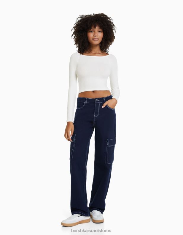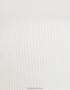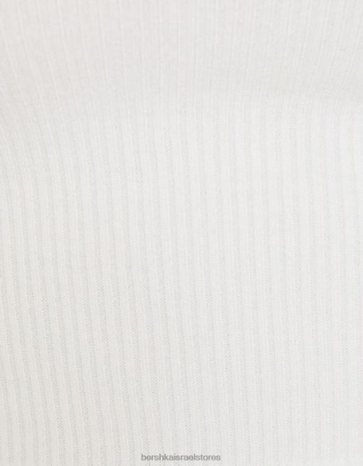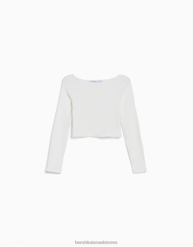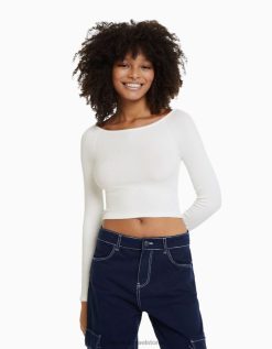 נשים חולצת טי עם שרוולים ארוכים פסים עם צווארון סירה קרם 2L6JD518 Bershka הַלבָּשָׁה