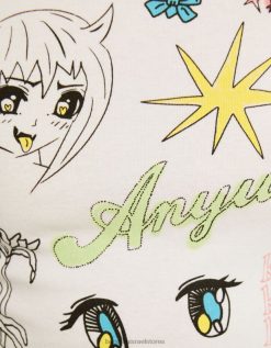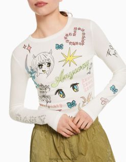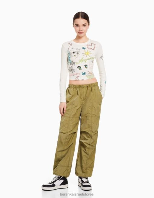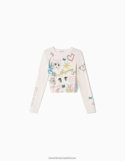 נשים חולצת טי שרוול ארוך עם הדפס צבע קרם 2L6JD622 Bershka הַלבָּשָׁה