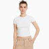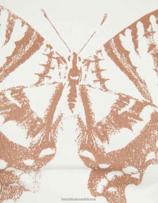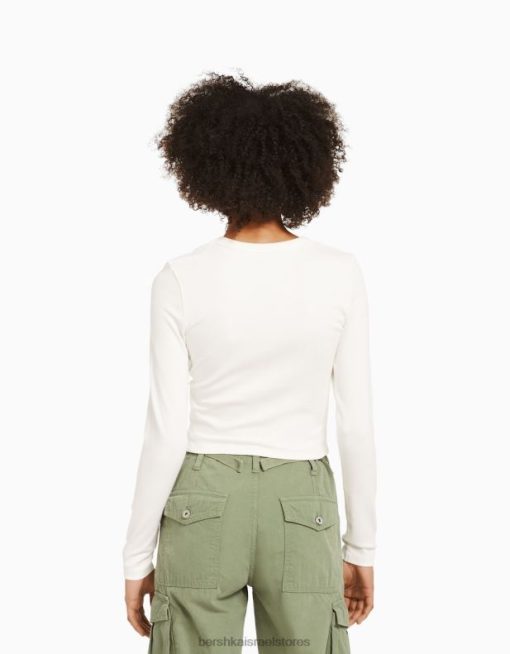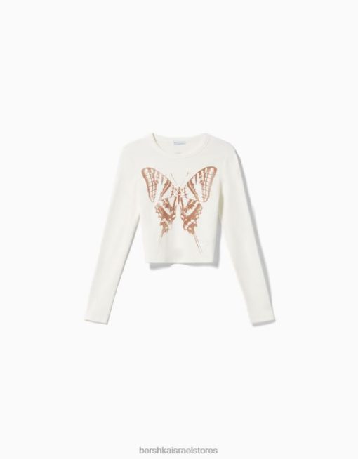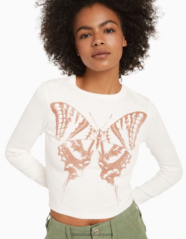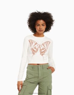 נשים חולצת טי שרוול ארוך עם הדפס קרם 2L6JD616 Bershka הַלבָּשָׁה