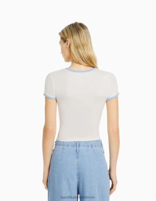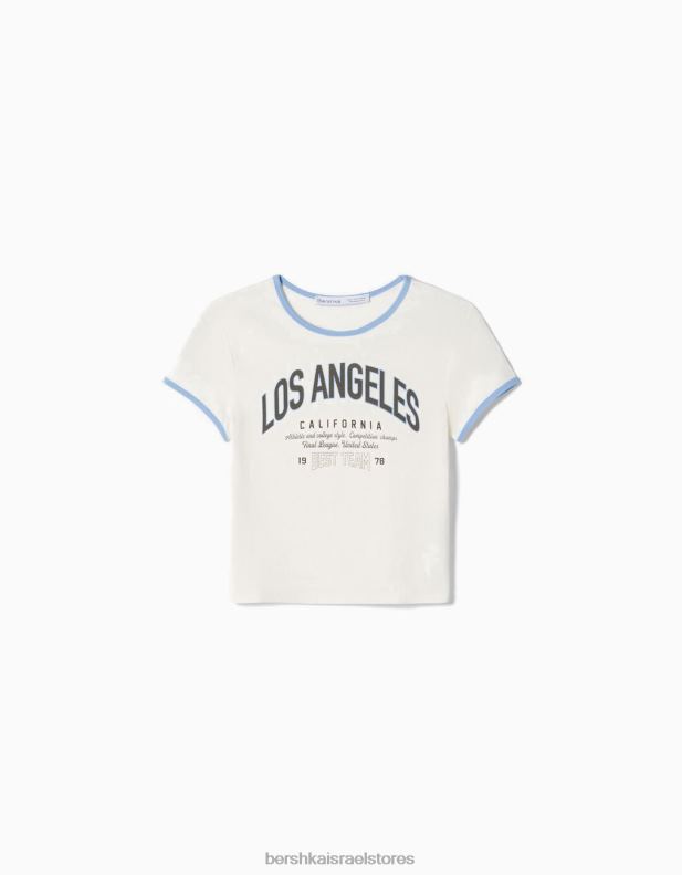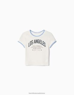 נשים חולצת טי שרוול קצר עם הדפס צבע קרם 2L6JD589 Bershka הַלבָּשָׁה