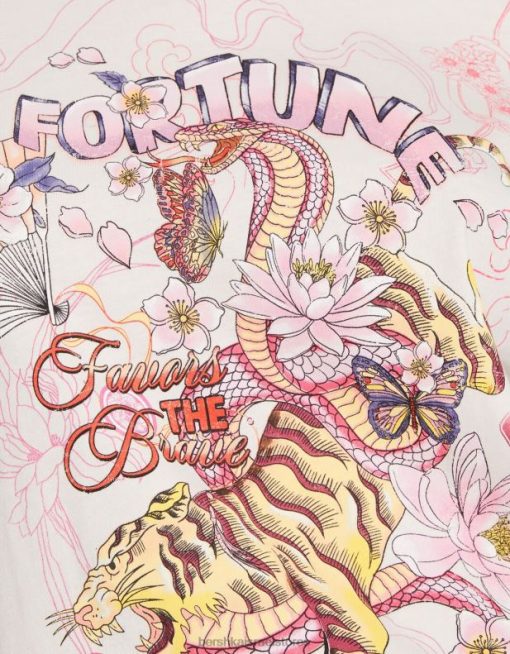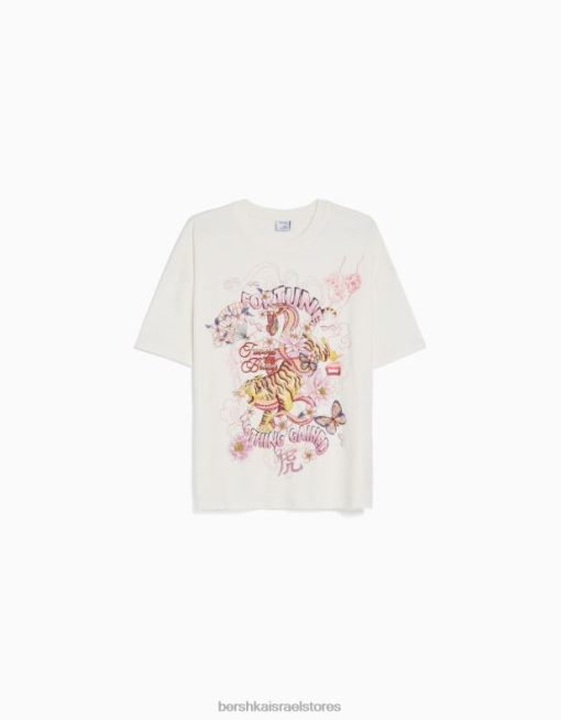 נשים חולצת טי שרוול קצר עם הדפס קרם 2L6JD329 Bershka הַלבָּשָׁה