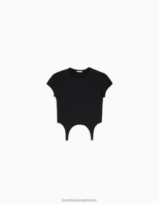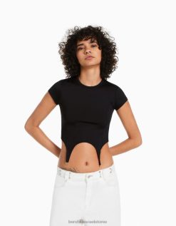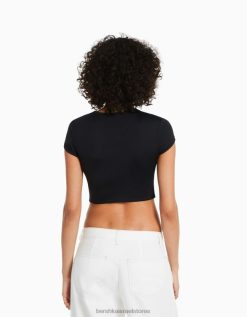 נשים חולצת טי שרוול קצר עם פירוט שָׁחוֹר 2L6JD511 Bershka הַלבָּשָׁה