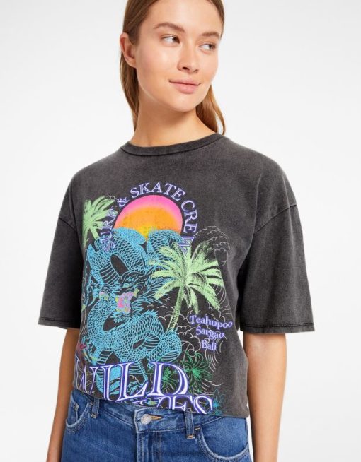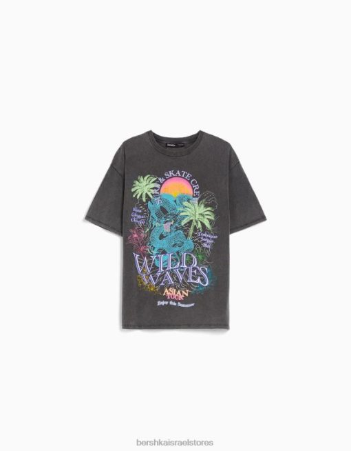 נשים חולצת טריקו בהדפסת שרוולים קצרים באפקט דהוי אפור 2L6JD467 Bershka הַלבָּשָׁה