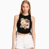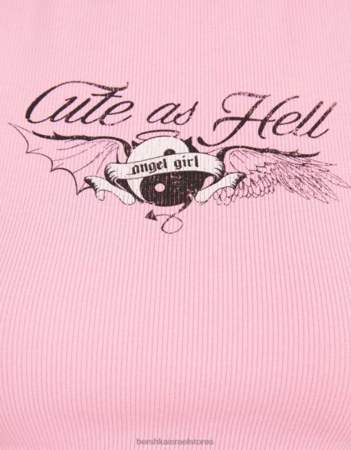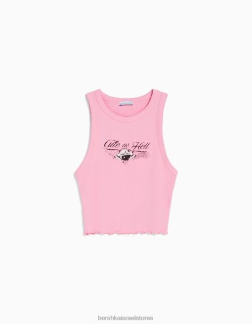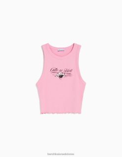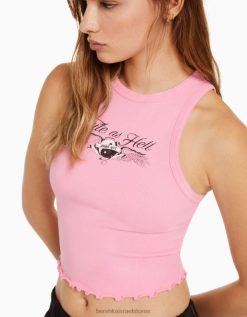 נשים חולצת טריקו ללא שרוולים מודפסת עם צלעות וָרוֹד 2L6JD630 Bershka הַלבָּשָׁה