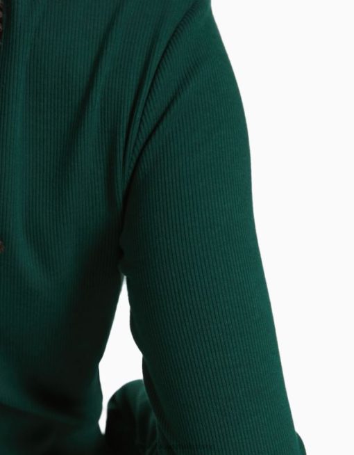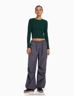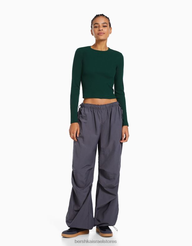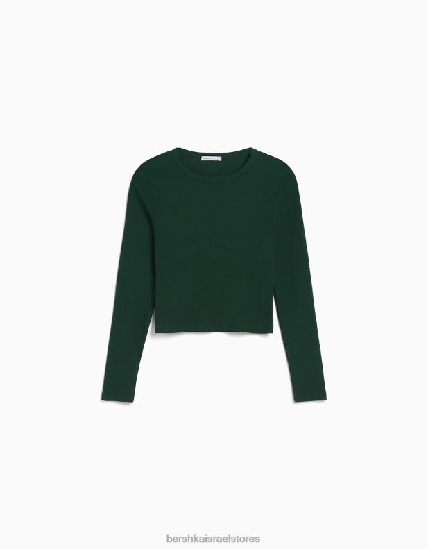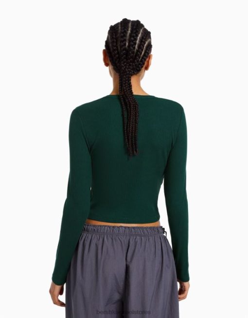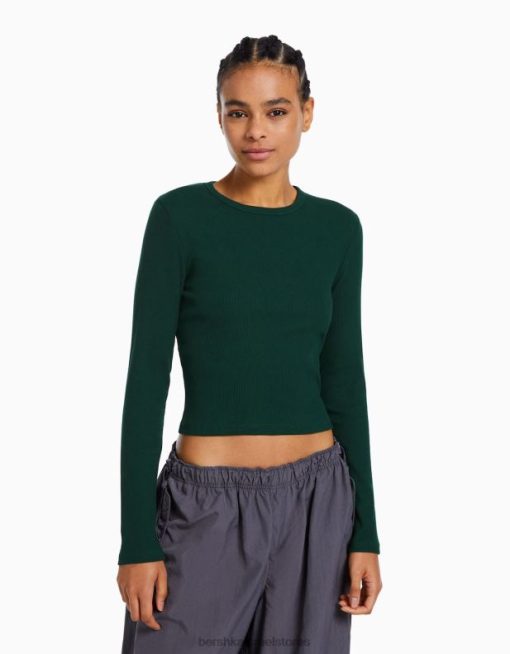 נשים חולצת טריקו עם שרוולים ארוכים עם צלעות ירוק 2L6JD437 Bershka הַלבָּשָׁה