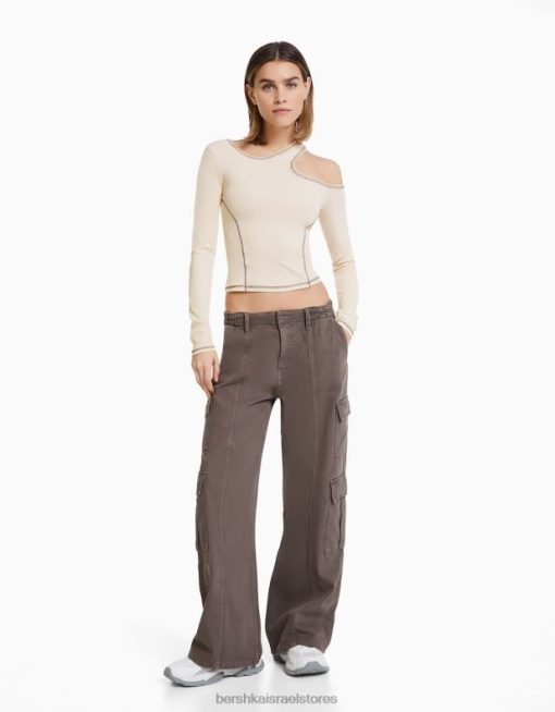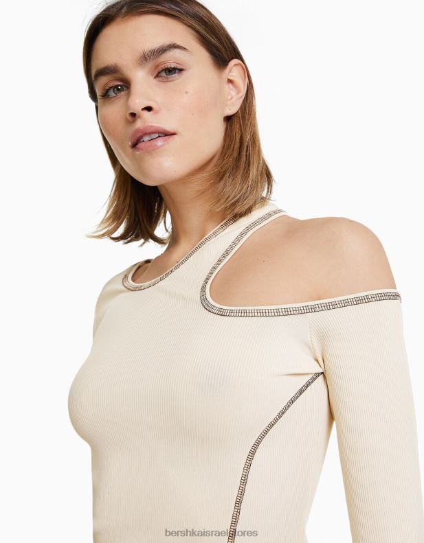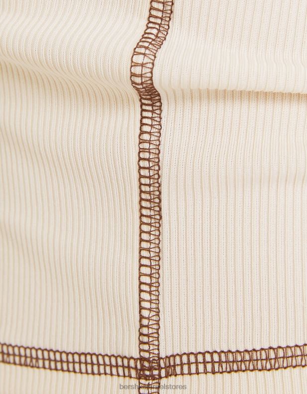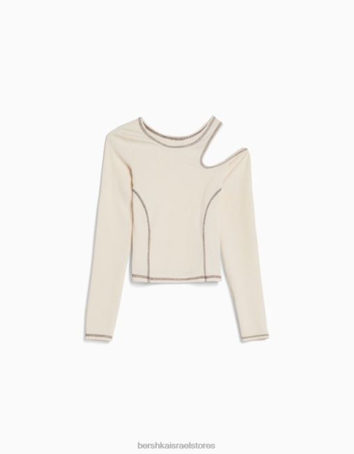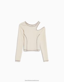 נשים חולצת טריקו עם שרוול ארוך עם חוט מנוגד קרם 2L6JD374 Bershka הַלבָּשָׁה