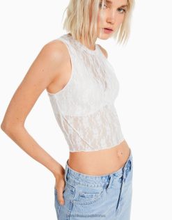 נשים חולצת תחרה ללא שרוולים קרם 2L6JD874 Bershka הַלבָּשָׁה