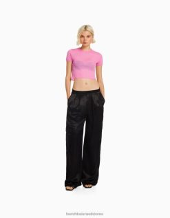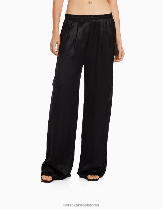 נשים מכנסי סאטן רחבים עם כיס שָׁחוֹר 2L6JD1325 Bershka הַלבָּשָׁה