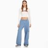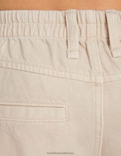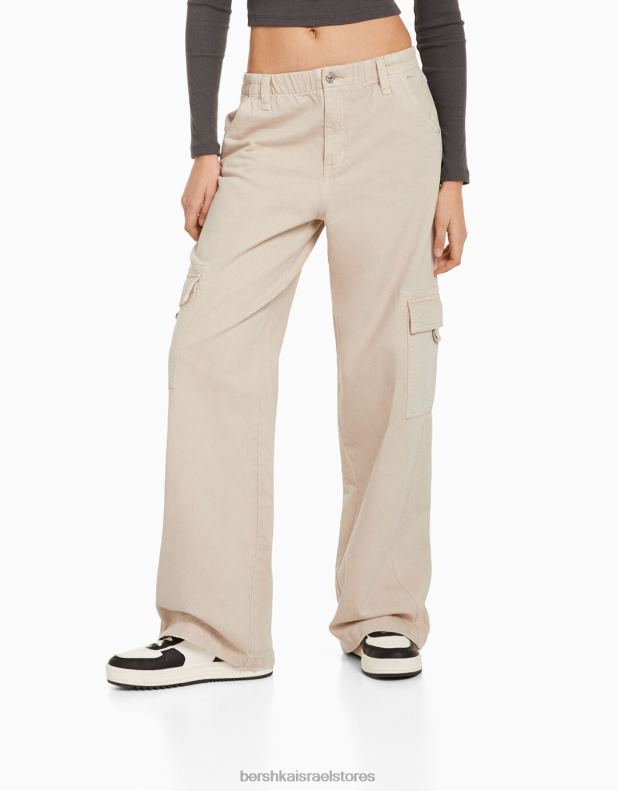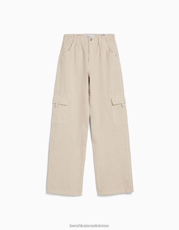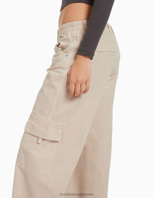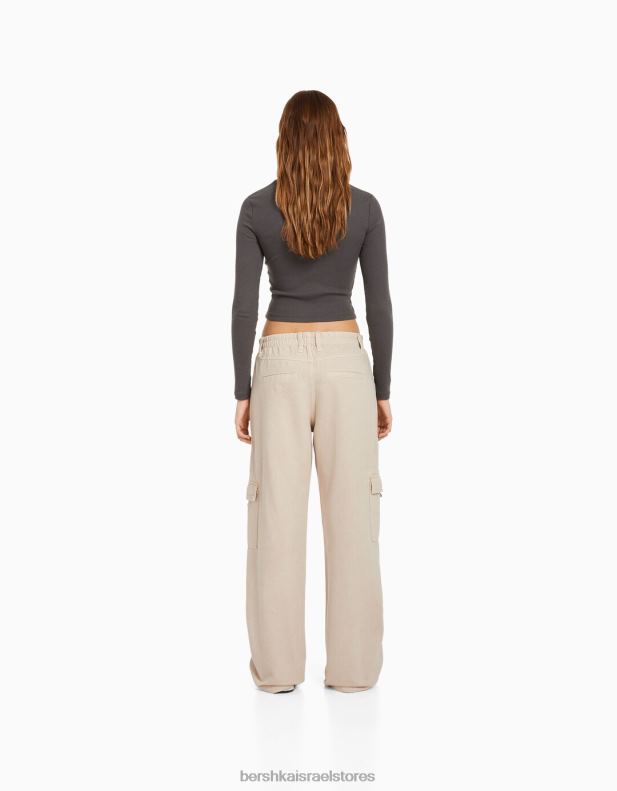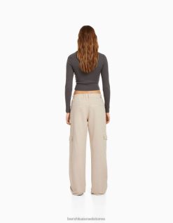 נשים מכנסי קרגו אריג בהתאמה ישרה עם רצועת מותן אלסטית אֶבֶן 2L6JD1394 Bershka הַלבָּשָׁה