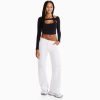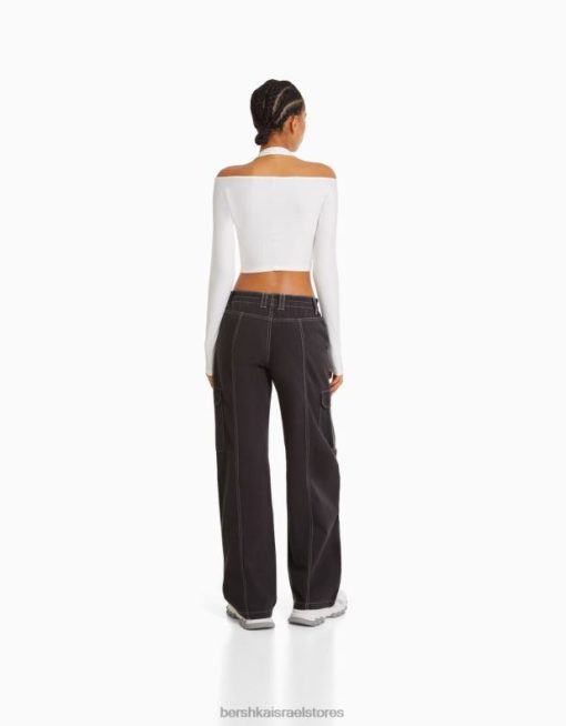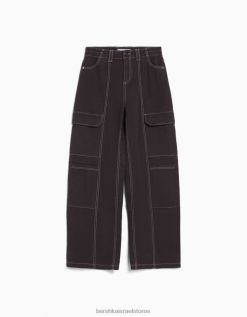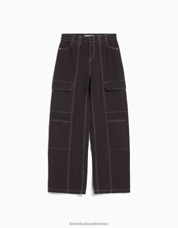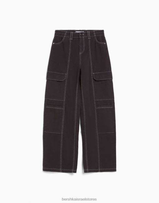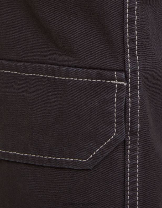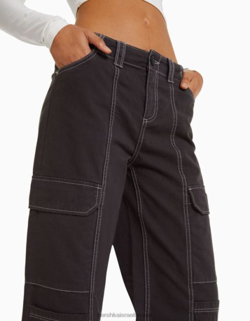 נשים מכנסי קרגו מכותנה בגזרה נמוכה עם חוט ניגודי אפור כהה 2L6JD1362 Bershka הַלבָּשָׁה
