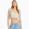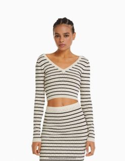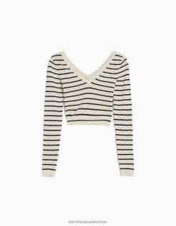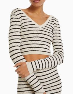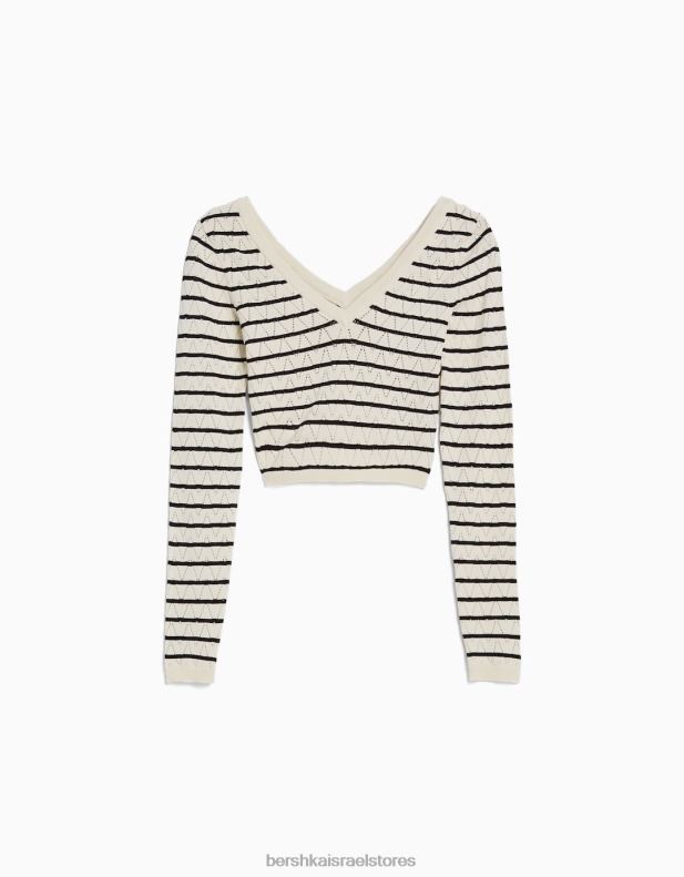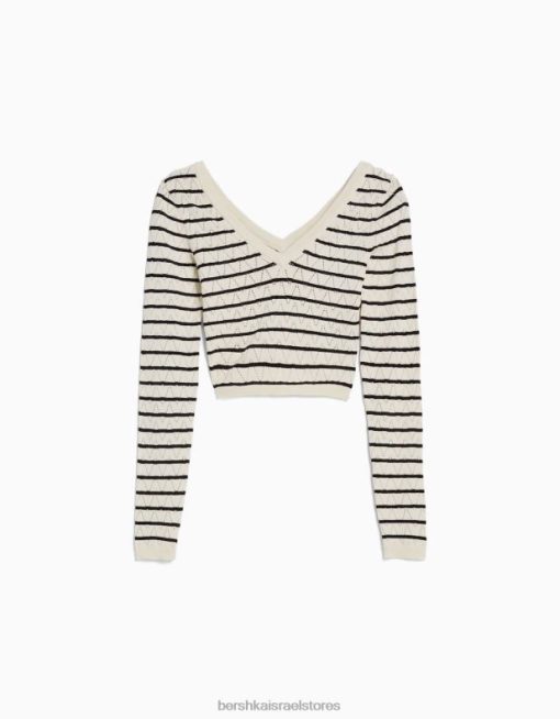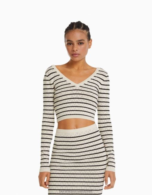 נשים סוודר סריג פתוח עם צווארון V קרם 2L6JD989 Bershka הַלבָּשָׁה