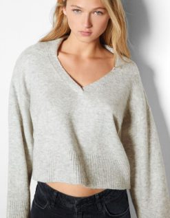 נשים סוודר עם צווארון פולו אפור 2L6JD1029 Bershka הַלבָּשָׁה