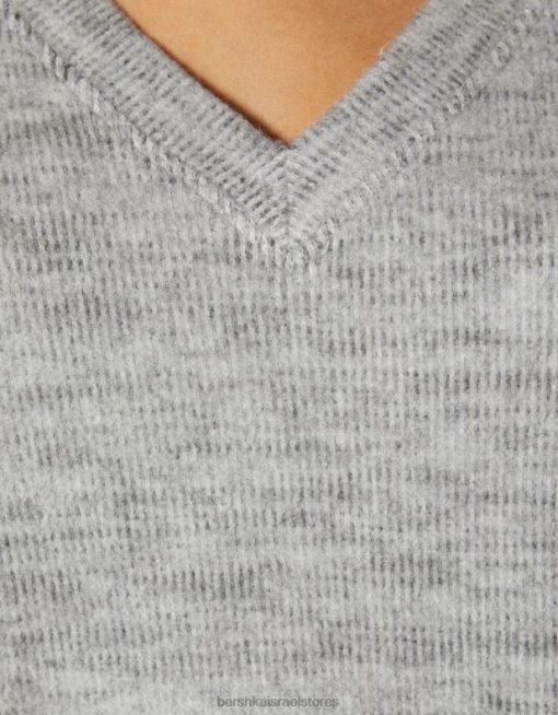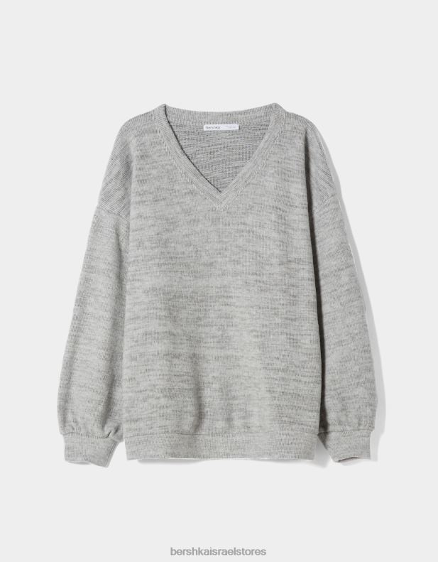 נשים סוודר עם צווארון V אפור 2L6JD1002 Bershka הַלבָּשָׁה