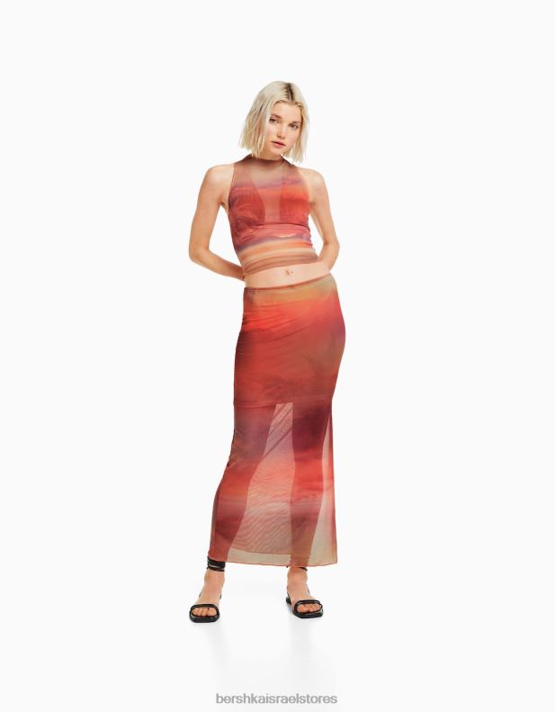נשים סט חולצת טריקו מודפסת ללא שרוולים וחצאית טול תפוז 2L6JD2032 Bershka הַלבָּשָׁה