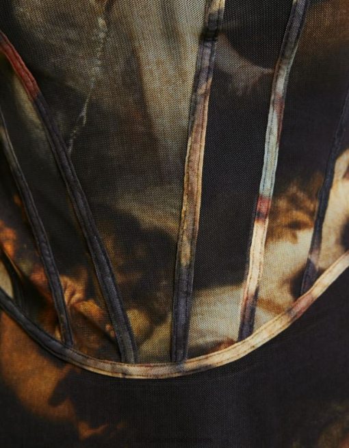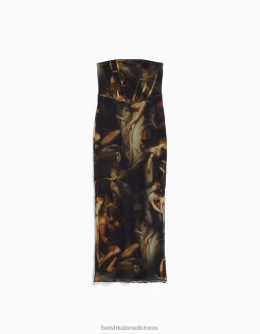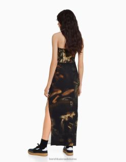 נשים שמלת טול מידי בהדפס סדרת אמנות שָׁחוֹר 2L6JD262 Bershka הַלבָּשָׁה