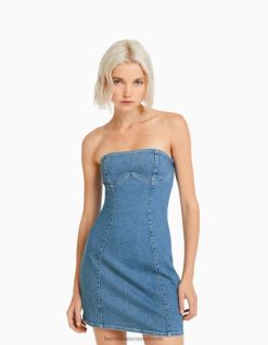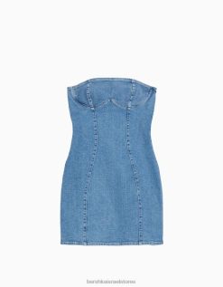 נשים שמלת מיני ג’ינס מחוץ לכתף בכושר relax fit כחול בהיר 2L6JD1827 Bershka הַלבָּשָׁה