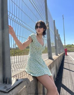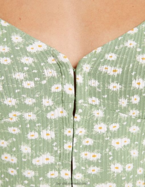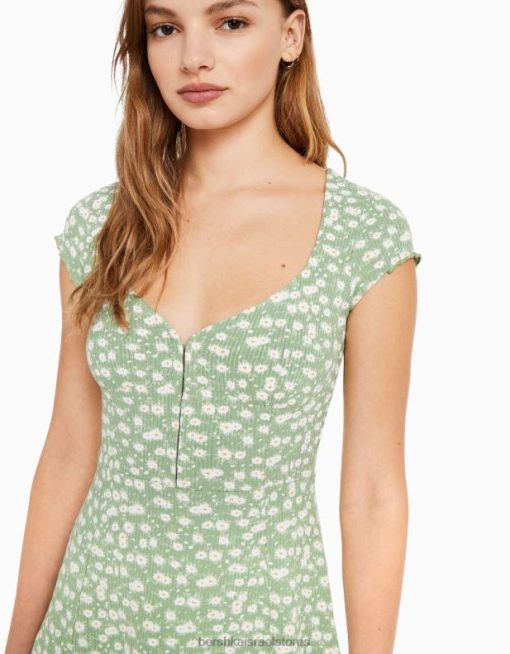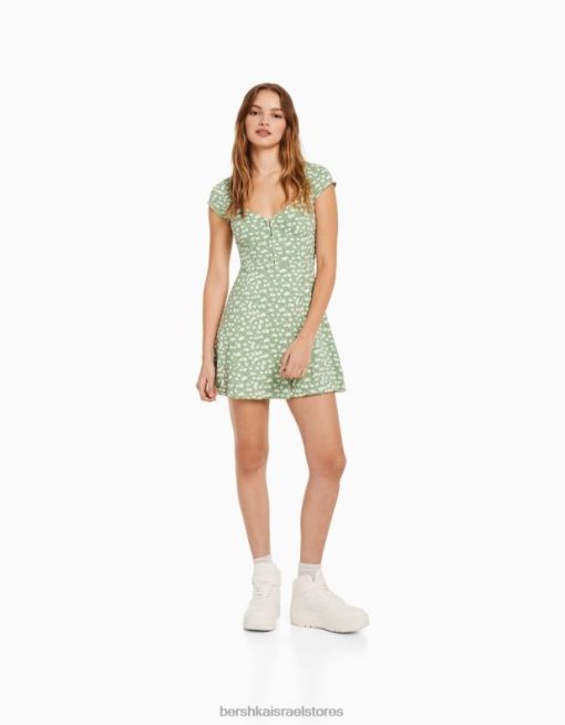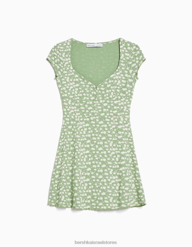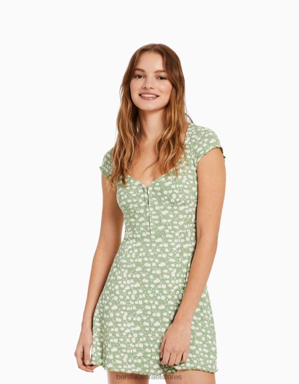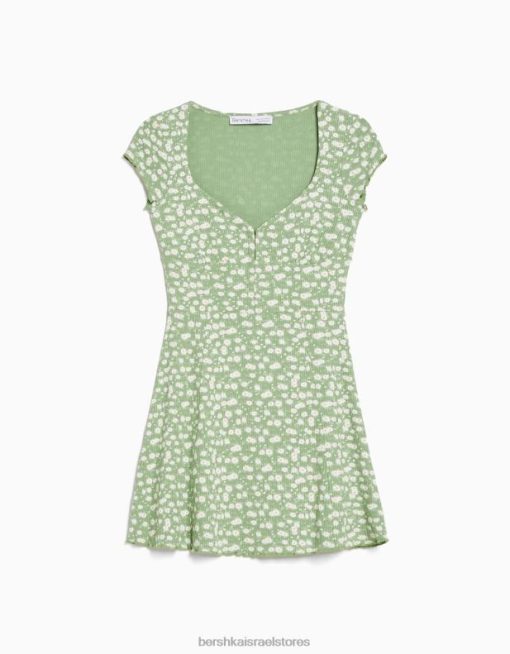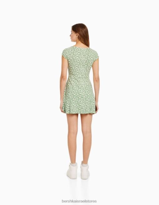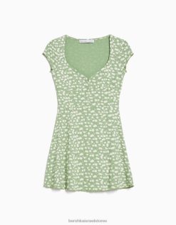 נשים שמלת מיני מודפסת עם שרוולים קצרים עם קו צוואר ירוק 2L6JD272 Bershka הַלבָּשָׁה