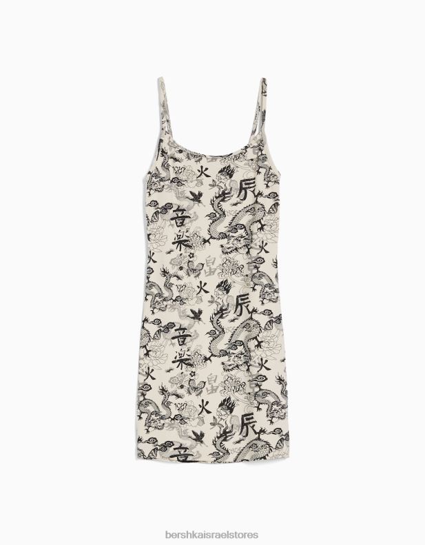נשים שמלת מיני רצועות מודפסת עם צלעות קרם 2L6JD11 Bershka הַלבָּשָׁה